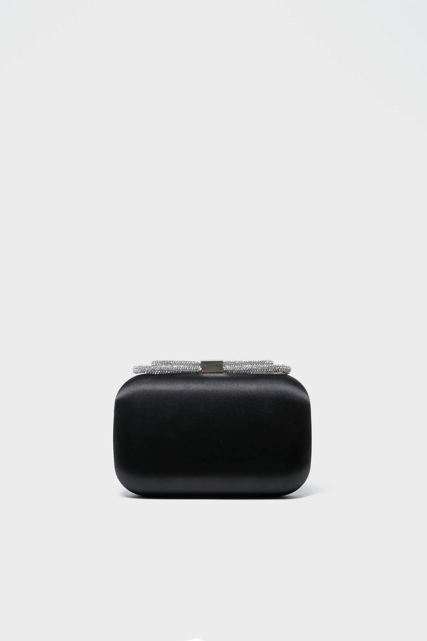The Black Ada Crystal Bow Clutch is a Red Carpet show stopper. It boasts a crystal embellished lock that is super sparkly and the shape fits comfortably in the palm of your hand. Wear this black satin purse as a clutch by tucking the shoulder chain inside the bag or wear it as a shoulder bag when you need to go hands free.