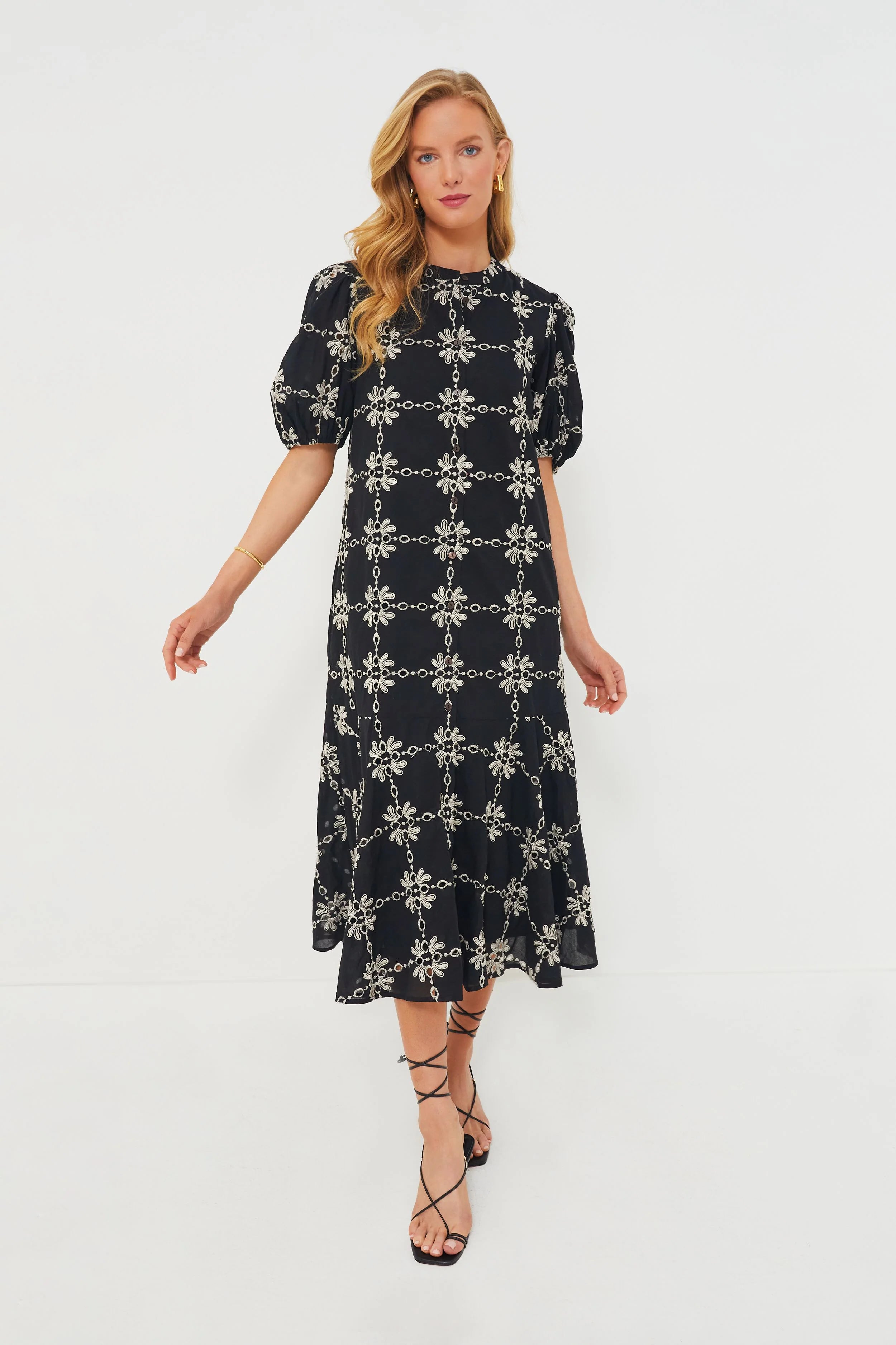 Perfectly combining all our favorite style elements in one, the Lewis features a button down front, statement puff sleeves, a carefree midi length and a stunning eyelet pattern to create the warm weather dress of our dreams. This elegant play on the classic shirt dress will take you from seaside vacations to al fresco celebrations with its easy cotton fabric and ready to be accessorized, effortless silhouette.