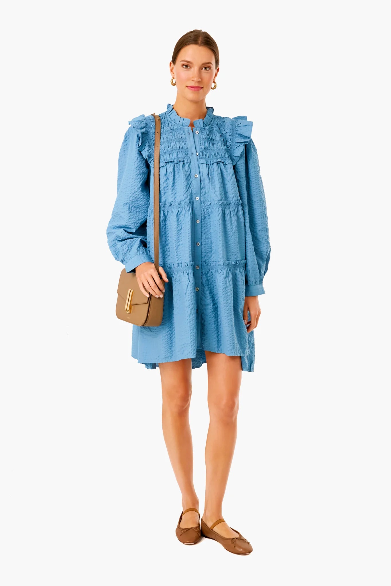The Blue Sevyn Solid Seersucker Button Down Dress features a relaxed silhouette with puff sleeves, smocked detailing, and a high-low hemline. Lightweight, textured fabric adds a unique twist to this best-selling silhouette. Style with a woven bag and flats for a breezy, transitional look.
