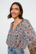Lightweight and effortless, the Caspia Silva Blouse is made from our lightweight shadow stripe cotton with botanicals in soft blue, orange, and red hues. This playful top features ruffle trim at neck with delicate self ties, long billowy sleeves, a drawstring to cinch for a more fitted look at the waist. We are pairing this with light denim for daytime and switching to black bottoms for a chic night on the town look.
