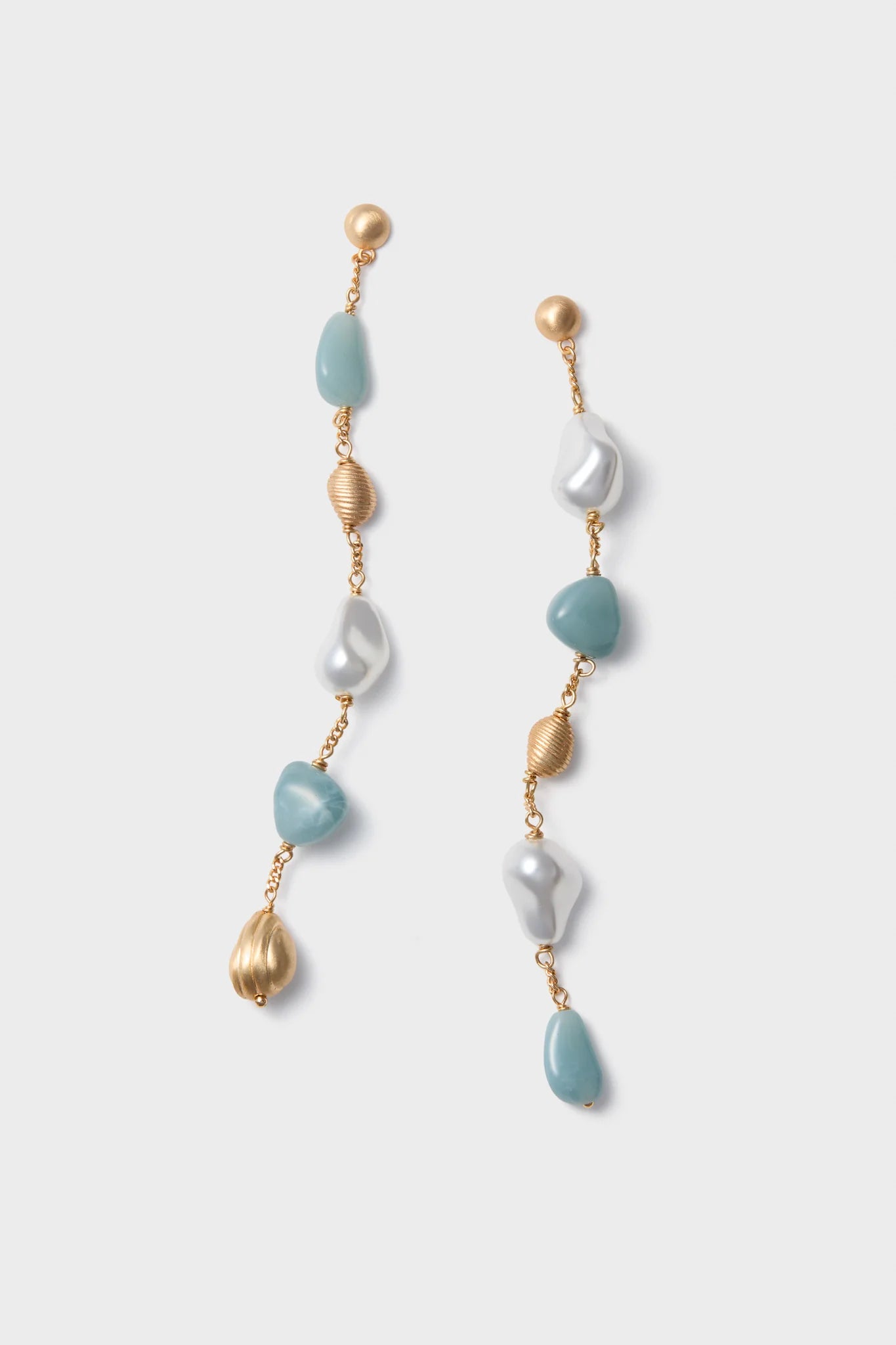 The Celadon Verona Earrings mix faux pearls, blue stones, and gold beads for a striking statement look. Perfect for evening events or brunches, they instantly elevate any outfit with chic, modern glamour.