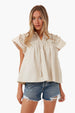 The Sevyn Solid Seersucker Short Sleeve Top is a flirty, boho blouse that is as effortlessly cool as it looks. Featuring flutter sleeves, tassel neck ties, and smocked detailing in a dreamy cream color, this piece can easily be worn three seasons a year. Pair it with shorts and sandals for a breezy, beachy look and change into jeans and booties when the weather cools down.