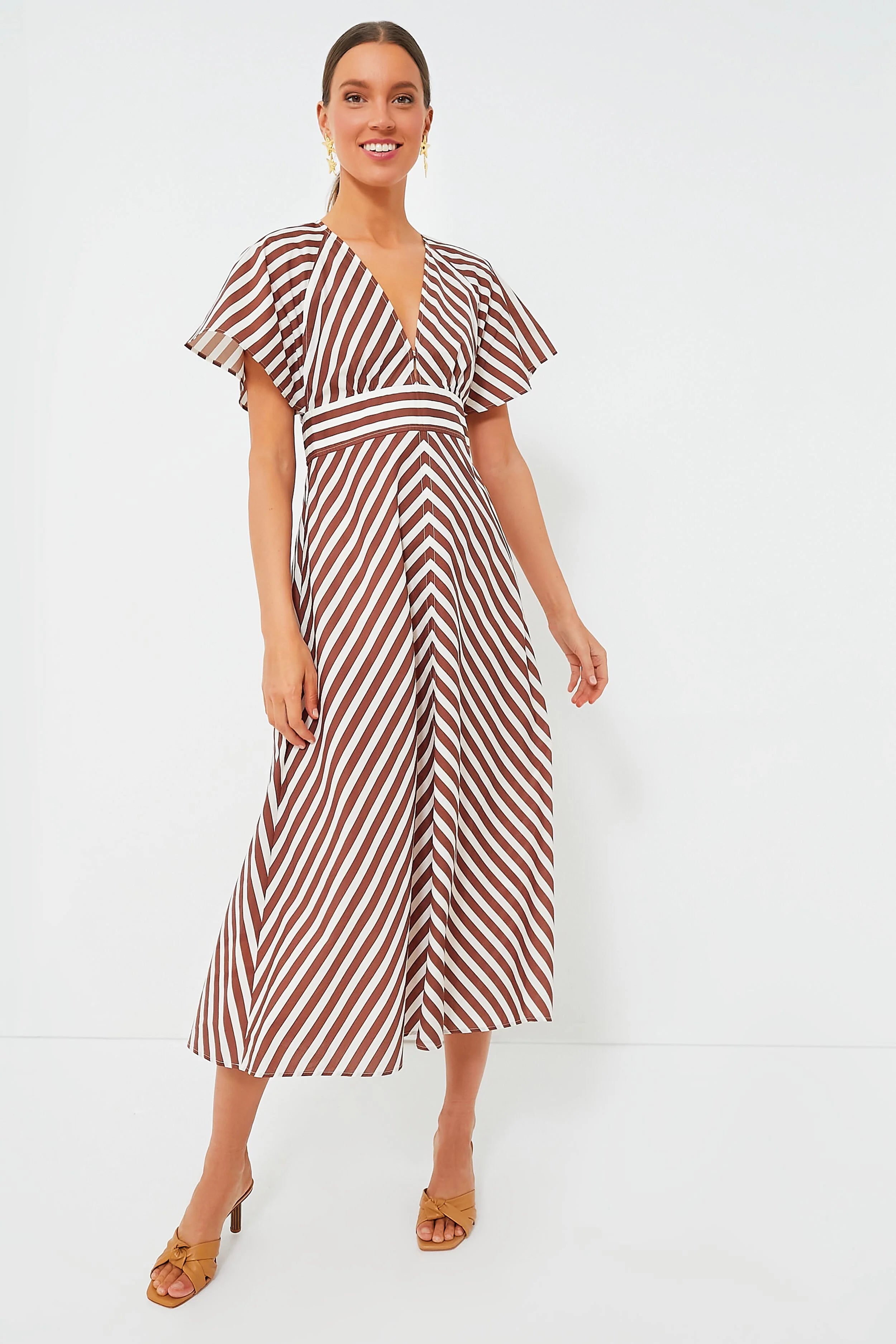 The Oroton Sorrento Stripe Tie Dress in Deep Spice offers both sophistication and comfort. Made from 100% Cotton poplin with a crisp and elegant fabric, the dress features flouncy raglan sleeves, fine gathers at the underbust, and a high waistline for a flattering fit. The A-line skirt adds grace to your movements, while small gathers at the back bodice complete the silhouette. We are pairing this look with leather sandals and a tote for a relaxed look, or with heels and gold jewelry for a more formal occasion.