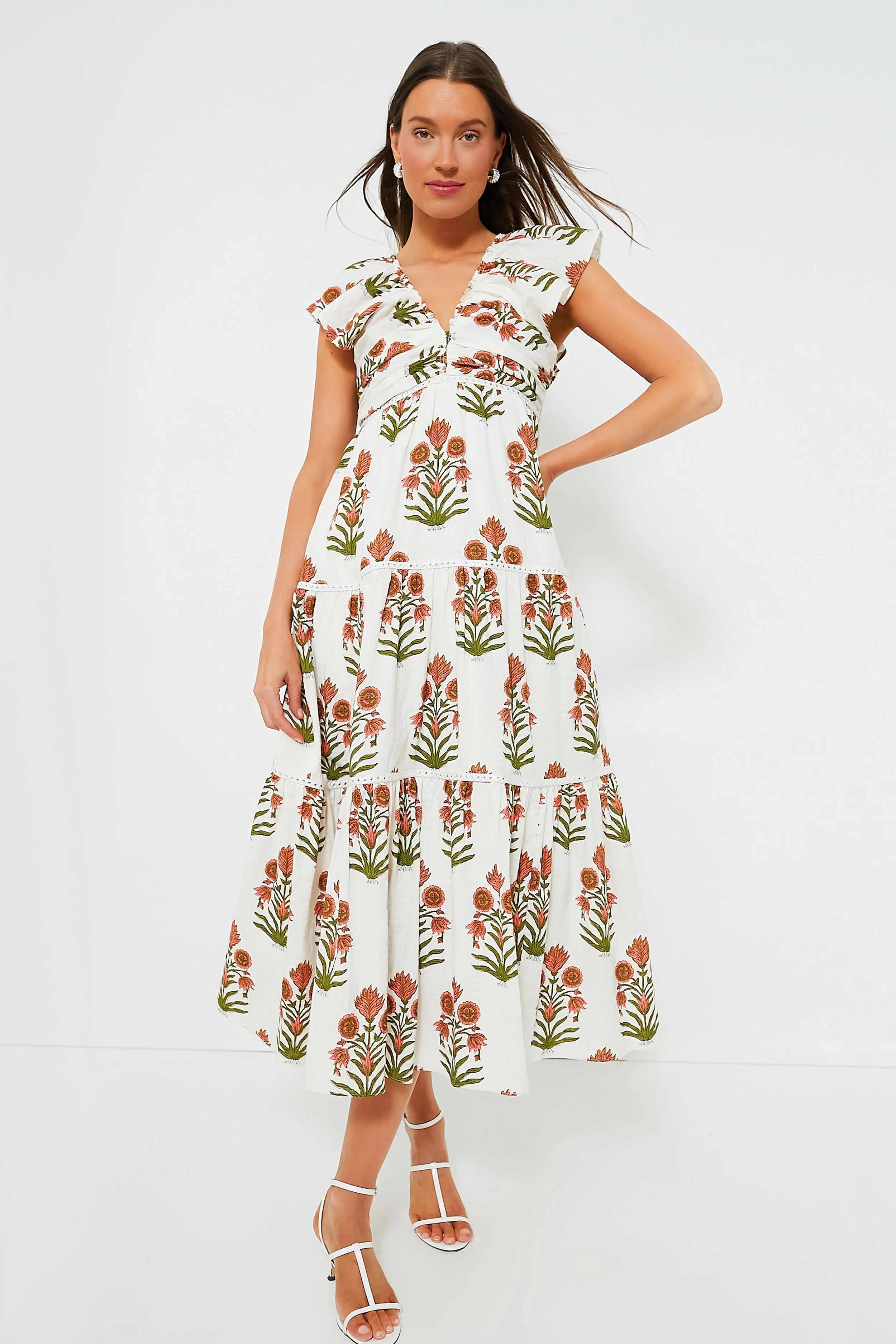 Botanical delights, this Desert Coral Sallyann Dress will put you on spring time (no garden needed). Cut from lightweight cotton and block printed with a gorgeous poppy field floral motif, this maxi features v-neckline, ruched bodice with flutter sleeves, and tiered skirt that adds adorable appeal to this breezy number. Style with wedges and a clutch for an al fresco dinner party, or with flat sandals and a tote for a ladies luncheon.