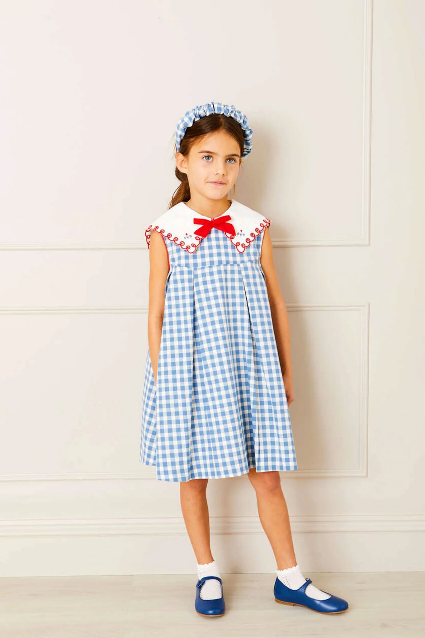 A classic silhouette and a timeless print, the Embroidered Gingham Sleeveless Dress, offers a vintage-inspired style with a contemporary blend to your little girl's wardrobe. It features a large gingham print in white and blue and is complimented by its' contrasting statement embroidery in scallop edging along the collar and detailed with a large red bow centered on the front. Your little one is sure to love this nautical inspired style.