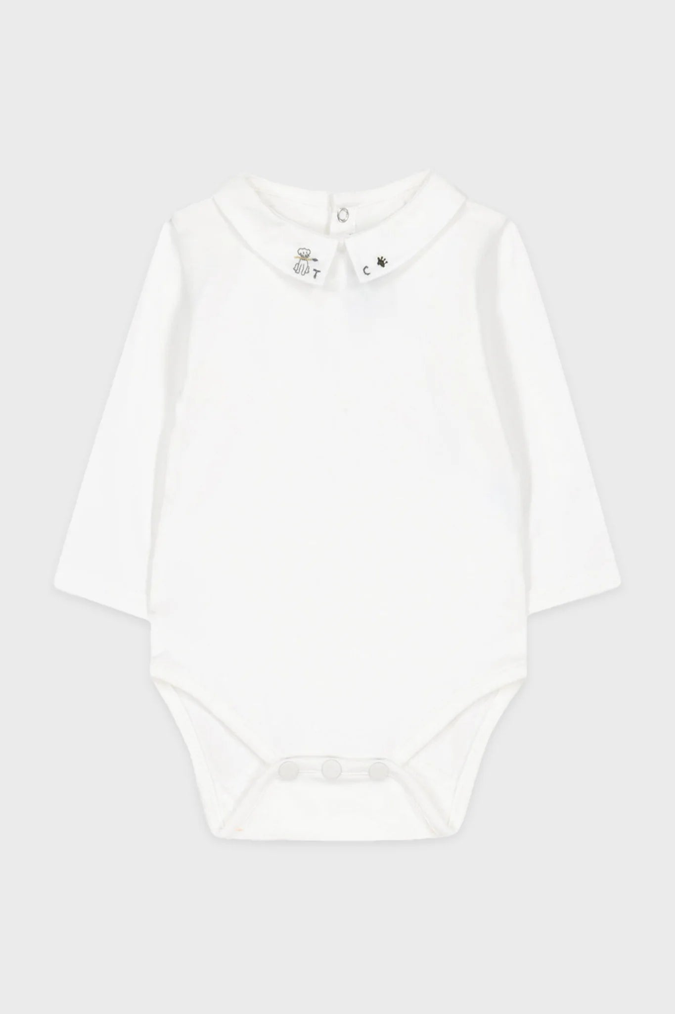 This creamy white bodysuit with adorable embroidery on collar is ideal for every day wear. The press studs on the back and between the legs allow easy dressing. Perfect for layering or on its own, pair them with a cozy sweater or under overalls for an effortlessly cute look perfect for playdates or family outings.