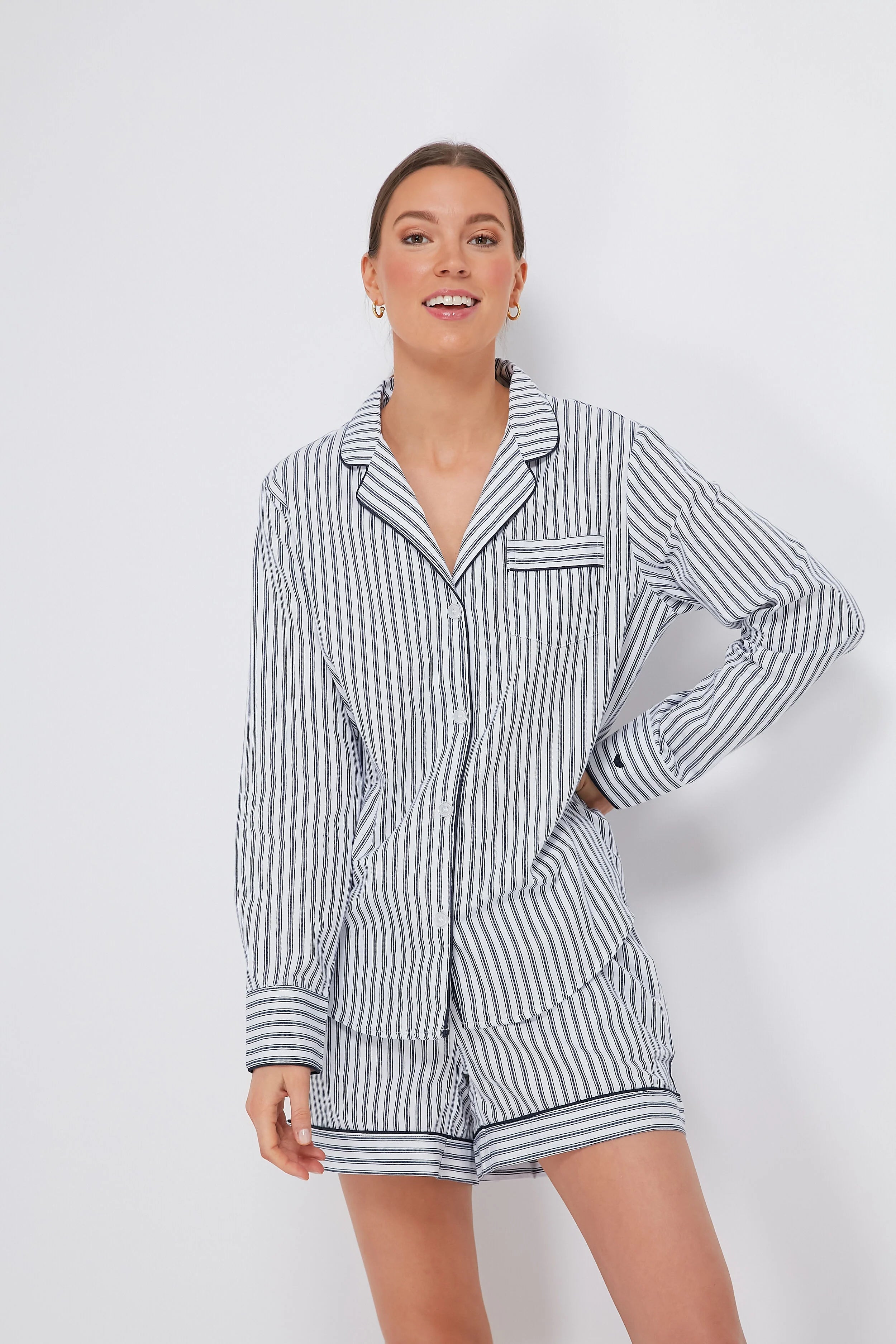 The elegant French Ticking Long Sleeve Short Set is here to stay with no frills just clean, crisp lines. This gorgeous pajama set is made from a lightweight yet luxe cotton twill, trimmed with navy piping, and finished with pearl buttons. Yarn-dyed to prevent fading and brushed for added softness, these get cozier after each wash. Wear them for sweet dreams or to enjoy your morning coffee in style.