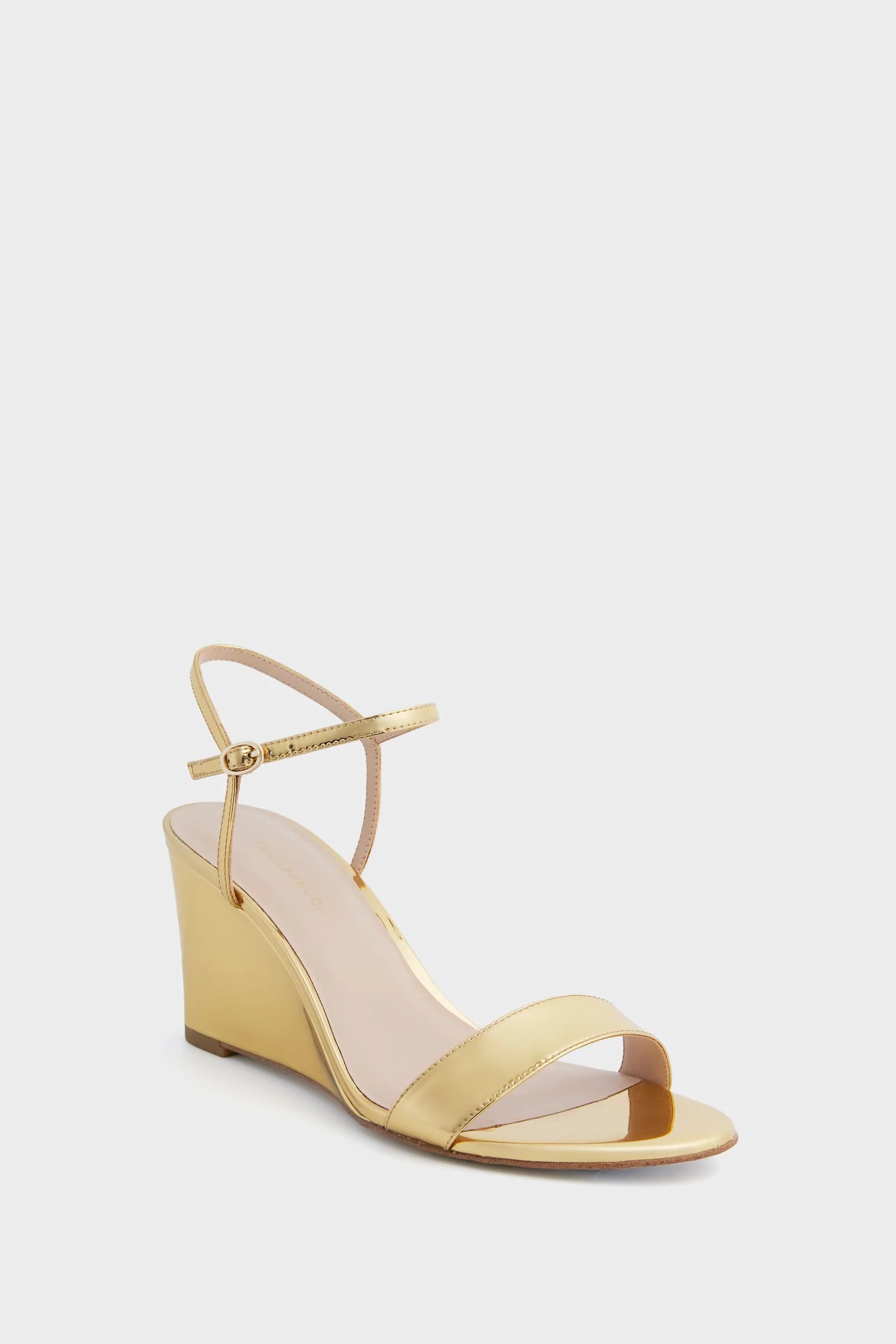 The Gold Delphine Wedges are a stylish closet staple that will go with everything. With a gold mirror upper and wedge, these are perfect for weddings, cocktail parties, and elevated events. Pair with a maxi dress and gold jewelry or with wide-leg trousers and a body suit!