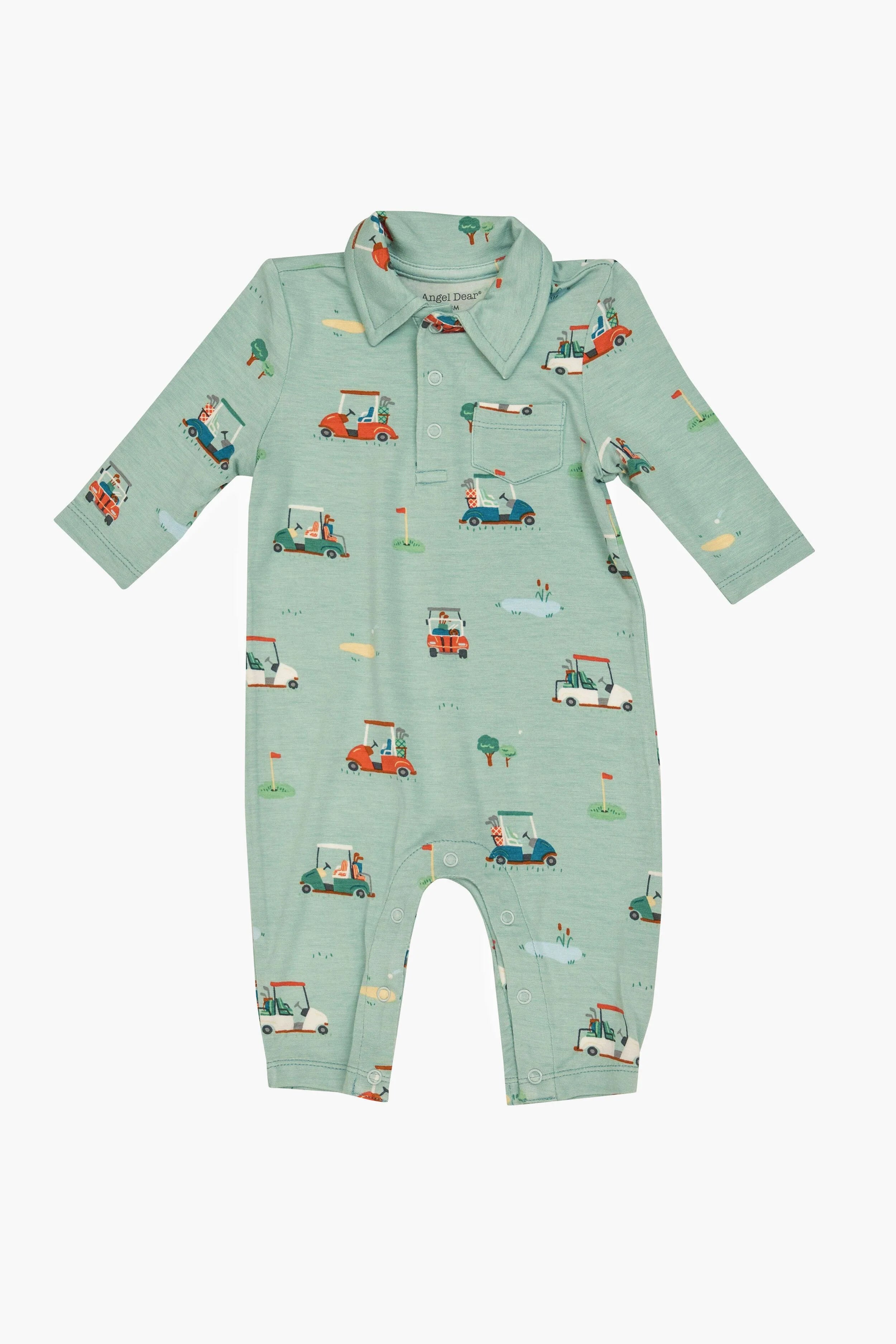 The Golf Carts Polo Romper is an adorable outfit for the future golfer in your life. The spread collar, front chest pocket, and snap button closure add adorable details, while the inner leg snaps allows for easy diaper changes.