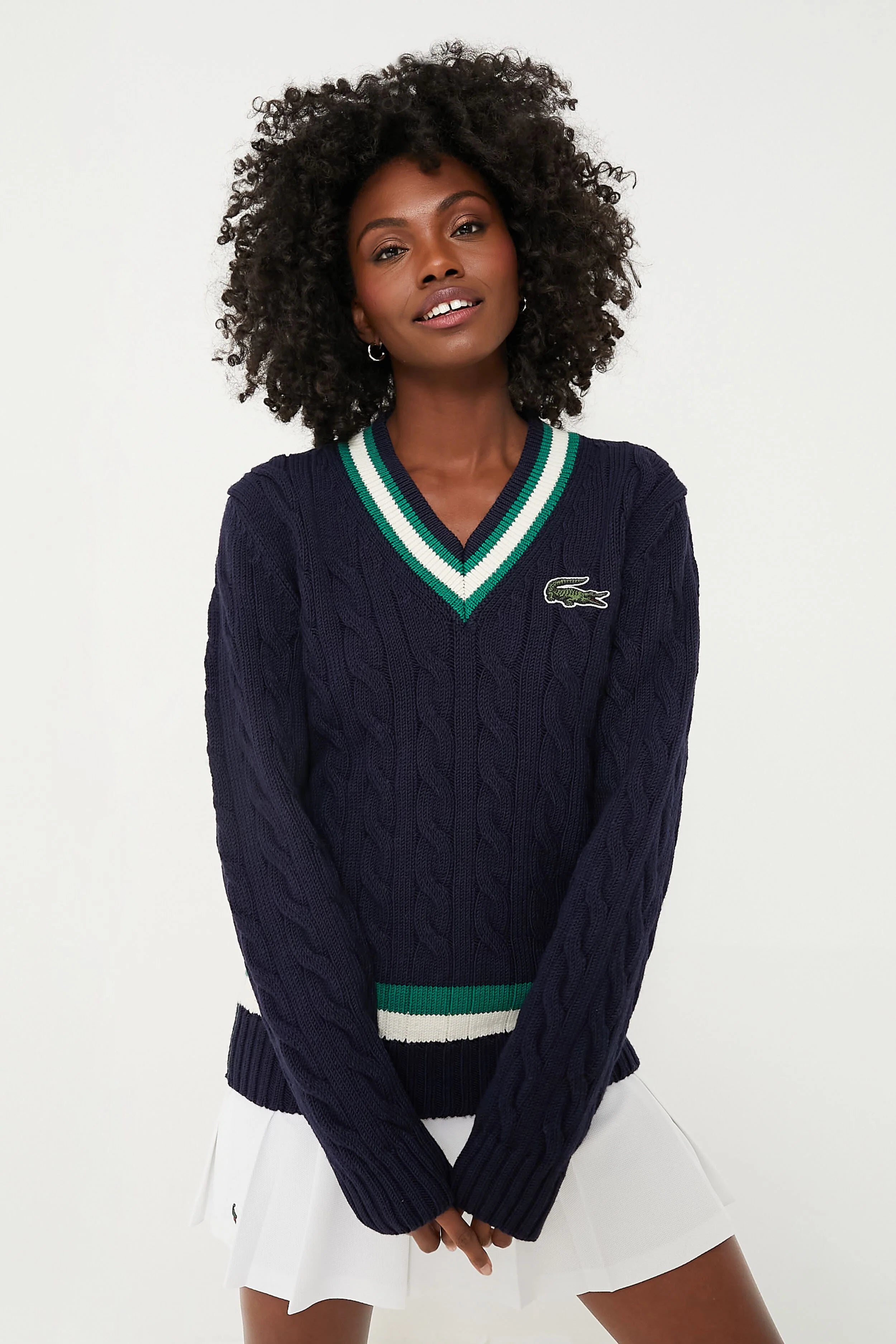 A new take on the essential style, the Marine Classic Cable Knit Tennis Sweater is timeless, versatile, and effortlessly cool. Featuring a chic V-neckline, striped trim, and doubled-up crocodile logos, there is nothing not to love about this classic look. Throw it over your tennis whites for a quick drink after your match, or style it with vintage denim for a unique look that's sure to earn you some compliments.