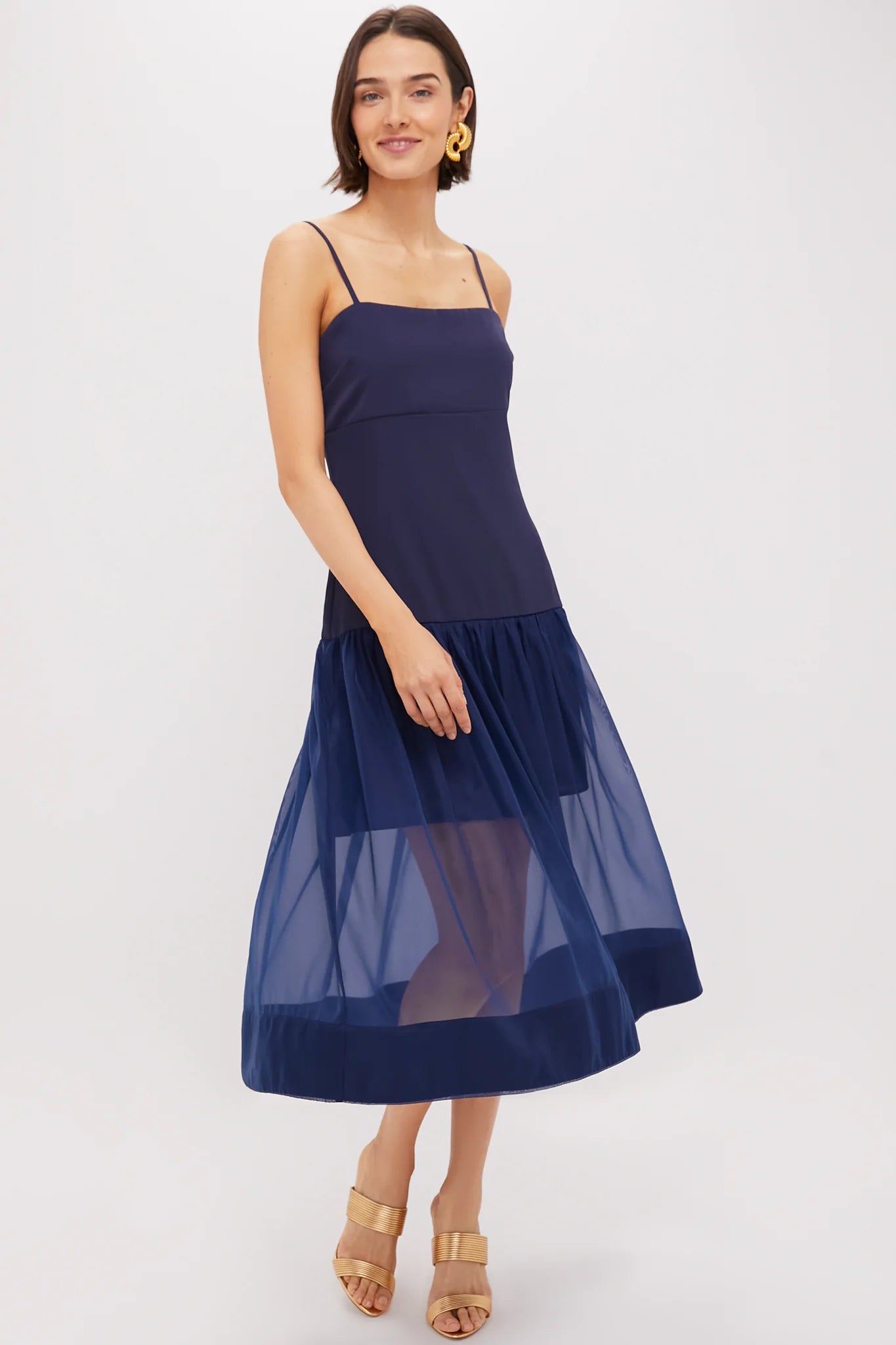 The Dawson Midi Dress boasts a flattering drop-waist silhouette with sheer paneling and a luxe crepe fabric. Perfect for weddings or date nights, we are styling it with a gold clutch and heels for a look that is sure to turn heads.