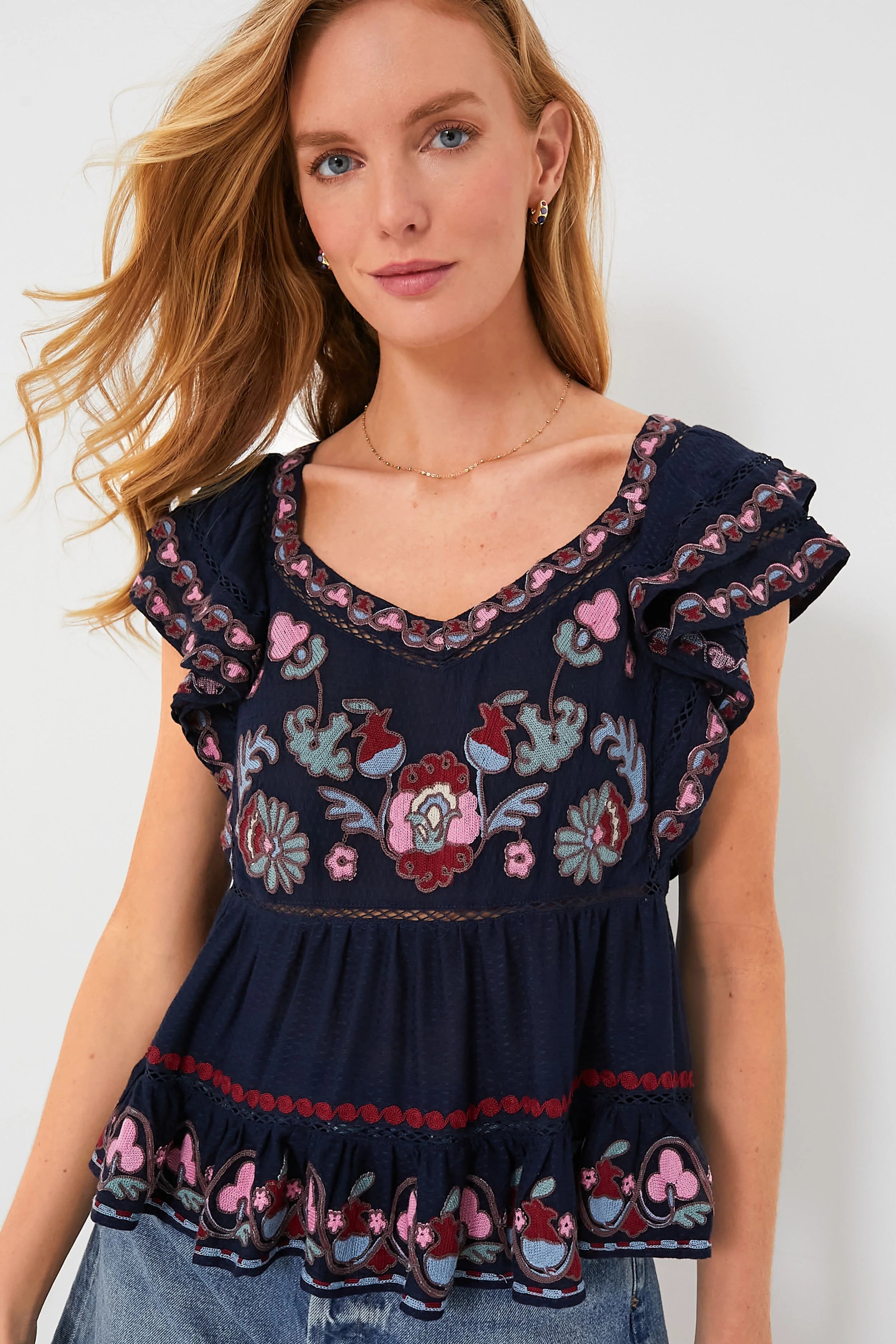 Feminine and free-spirited, the Navy Eclisse Embroidery Flutter Sleeve Top is a perfect style for the warm-weather months. This flattering blouse features short ruffle sleeves, an open V-neckline, and delicate lace trim. The embroidered floral detailing and ruffle hem adds a graceful touch. Pair with denims shorts and sandals, or dress up with wide leg denim and boots.