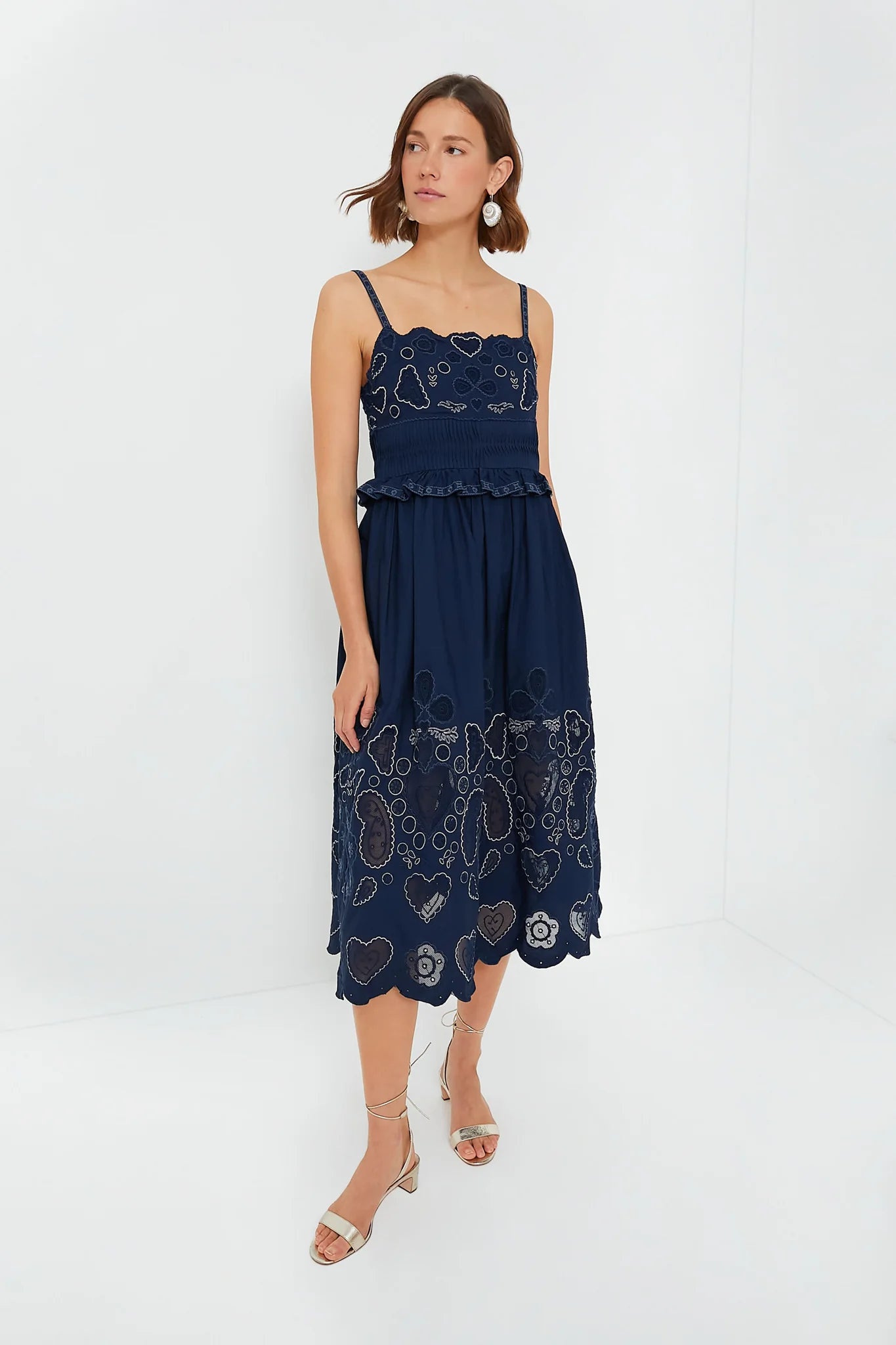 Feminine and flattering, the Navy Jeanetta Eyelet Sleeveless Dress is a beautiful addition to your closet. With a smocked bodice, delicate eyelet detailing throughout and scalloped hemline, this midi is seamlessly transitions from day to night. We love styling it with sandals for an easy daytime look and switch to heels and statement jewelry for a night of cocktails and celebration with friends.