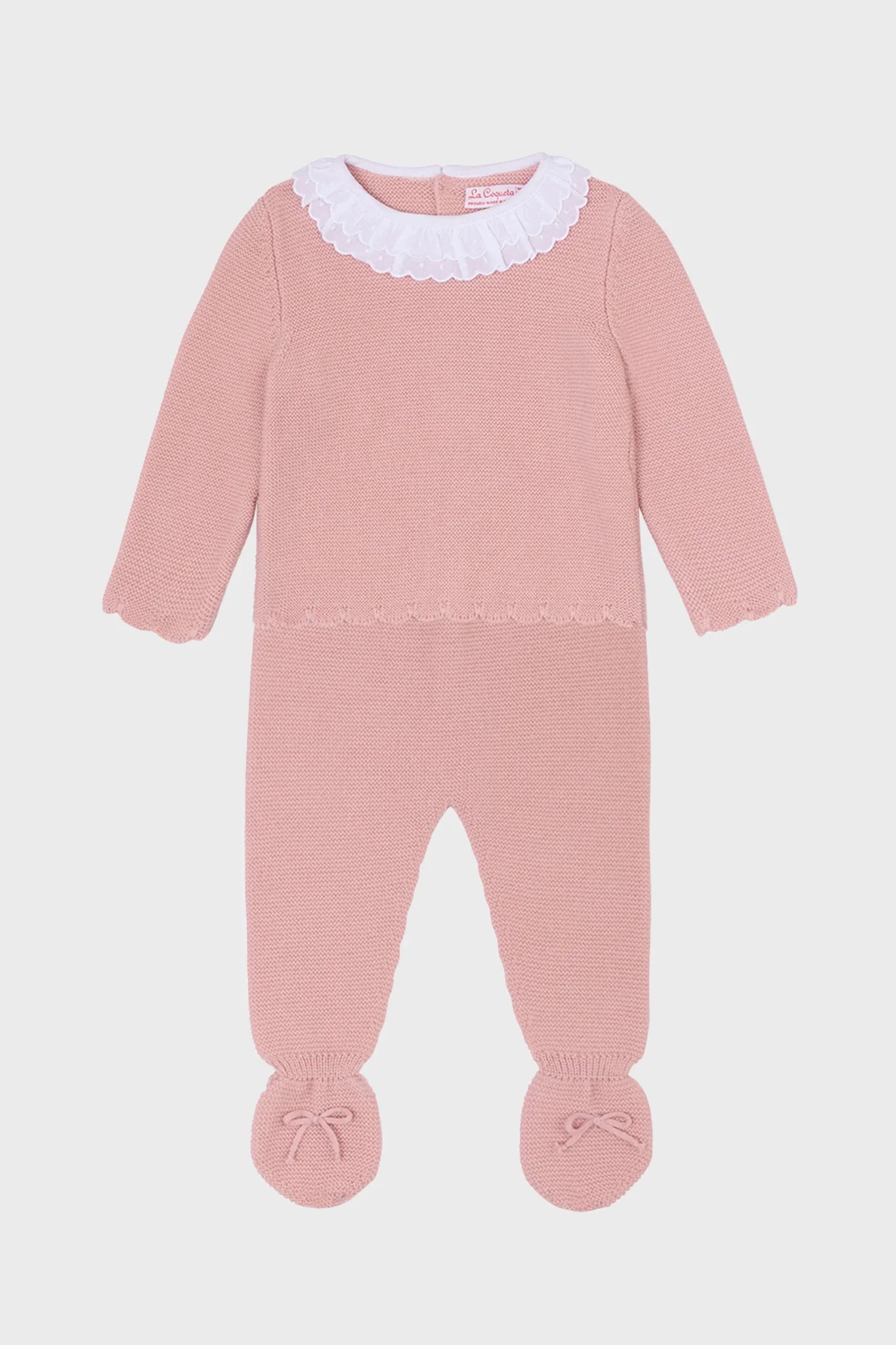Crafted from a pure Merino wool in a fine gauge knit, this Pink Amaya Merino Baby Knitted Set features a relaxed fit with a comfortable round neck, and mother of pearl buttons to fasten at the back for easy changing. The matching trousers have long legs and an elasticated waistband with attached booties for extra comfort in colder climates.