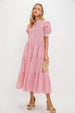 The Red & White Quatrefoil Bennett Maxi Dress boasts a flattering silhouette, with a defined waist and a tiered midi skirt. The unique print adds a touch of freshness, ensuring you stand out with grace and style at a multitude events such as garden parties, brunches, or casual gatherings. Style it with strappy heeled sandals and mini tote for a sophisticated ensemble.