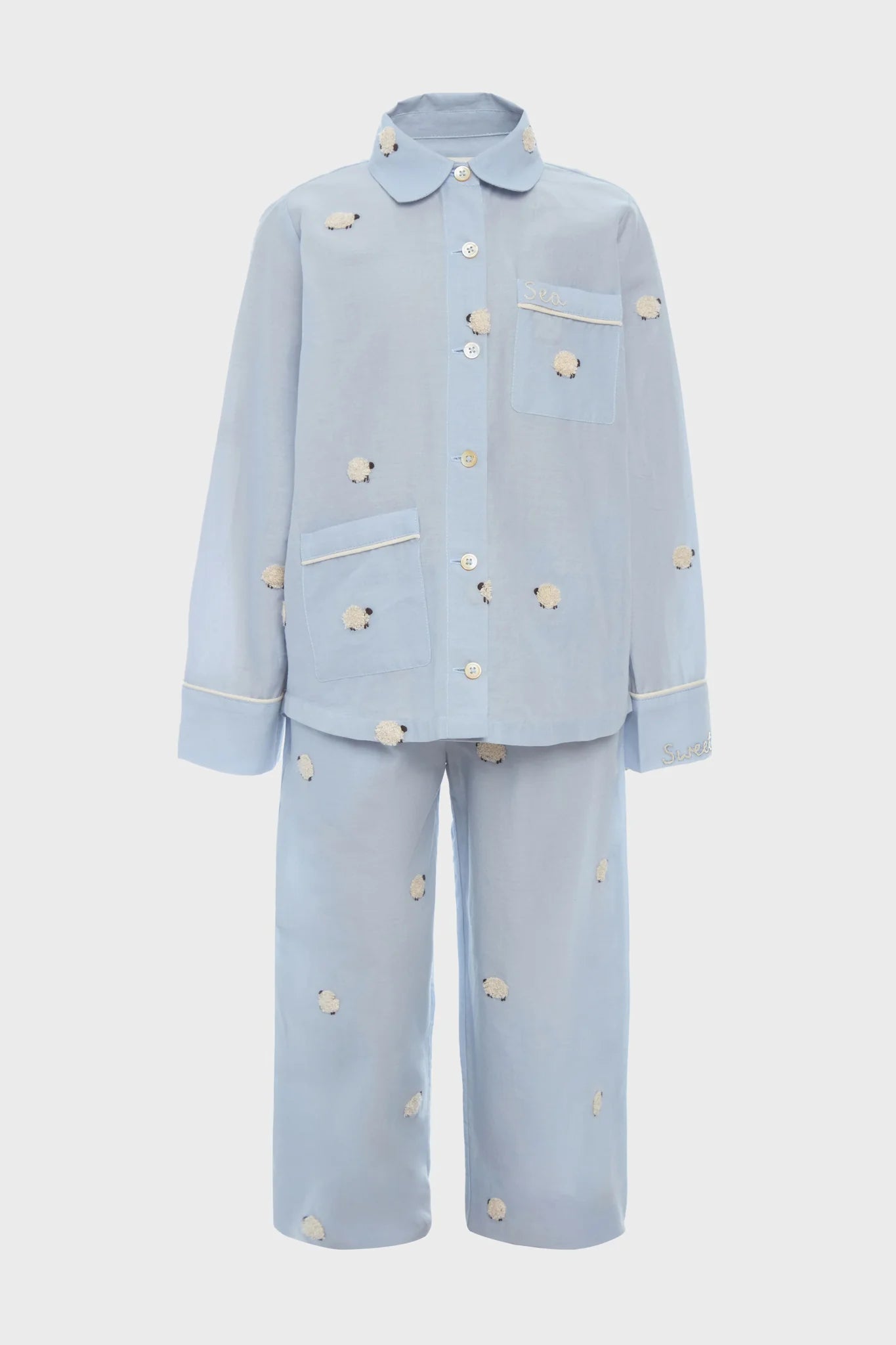 The Sky Sheep Kids PJ Set won't keep your little one up at night counting sheep! Featuring embroidered sheep accents throughout, embroidered 'Sweet Dreams' on the cuff, and a relaxed fit, they'll stay comfy and cozy all night long! Match with your little one with the matching Sky Sheep Sleepwear Button Down PJ Set.