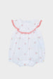 This short jumpsuit in white plumetis fabric is ideal for newborn girls, bringing a touch of summer elegance from the very first days. It features a floral print, a round neck and a flounce adorned with refined lace. Sleeveless for added lightness, this piece combines comfort and charm, perfect for sunny days.